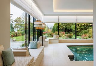 La casa también cuenta con una amplia zona de bienestar y spa con piscina cubierta, sauna y gimnasio. Siete sistemas de estores SG 2360 se pueden accionar individualmente y proporcionan sombra en la zona de la piscina. Los sistemas de estores se integran a la perfección en la estancia gracias a la tecnología oculta tras un falso techo.